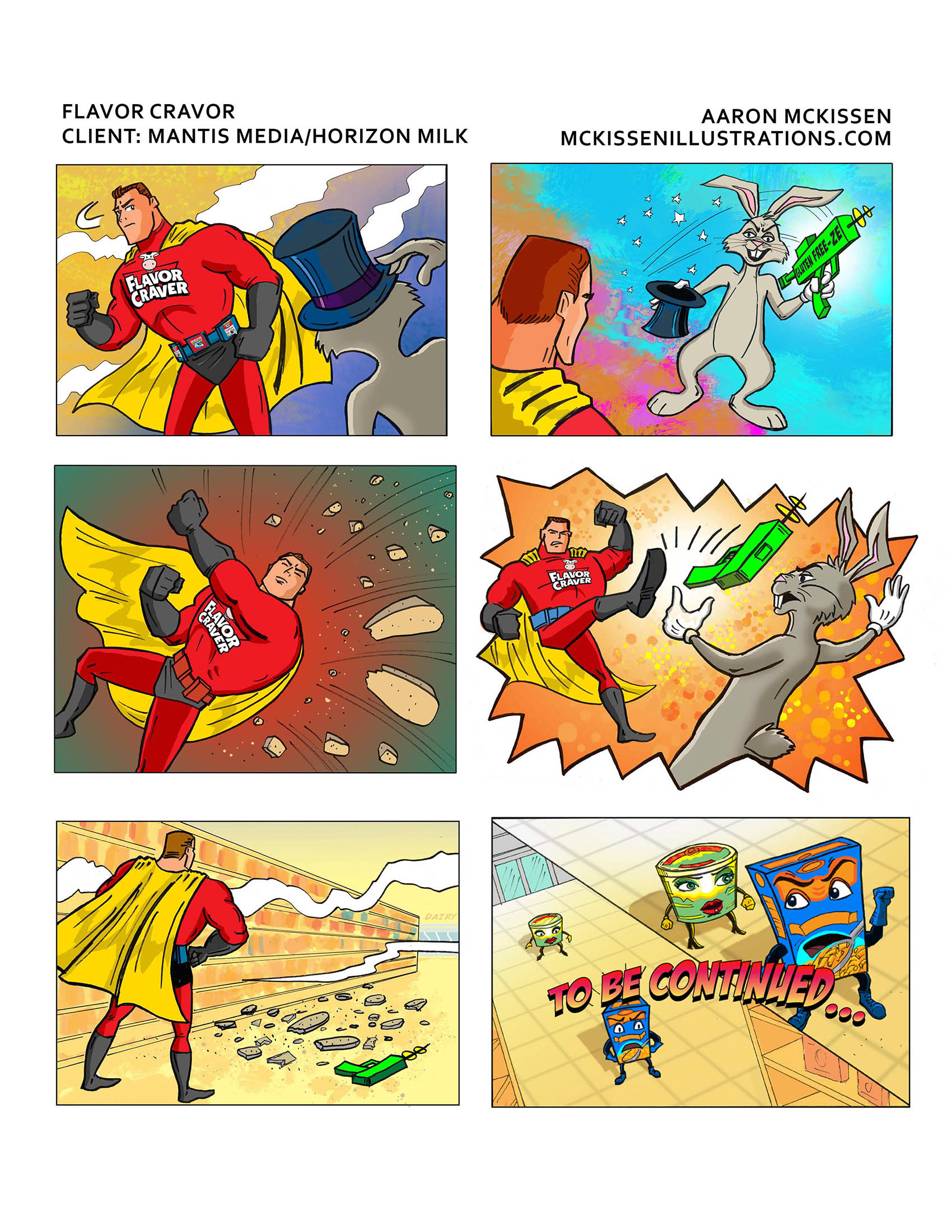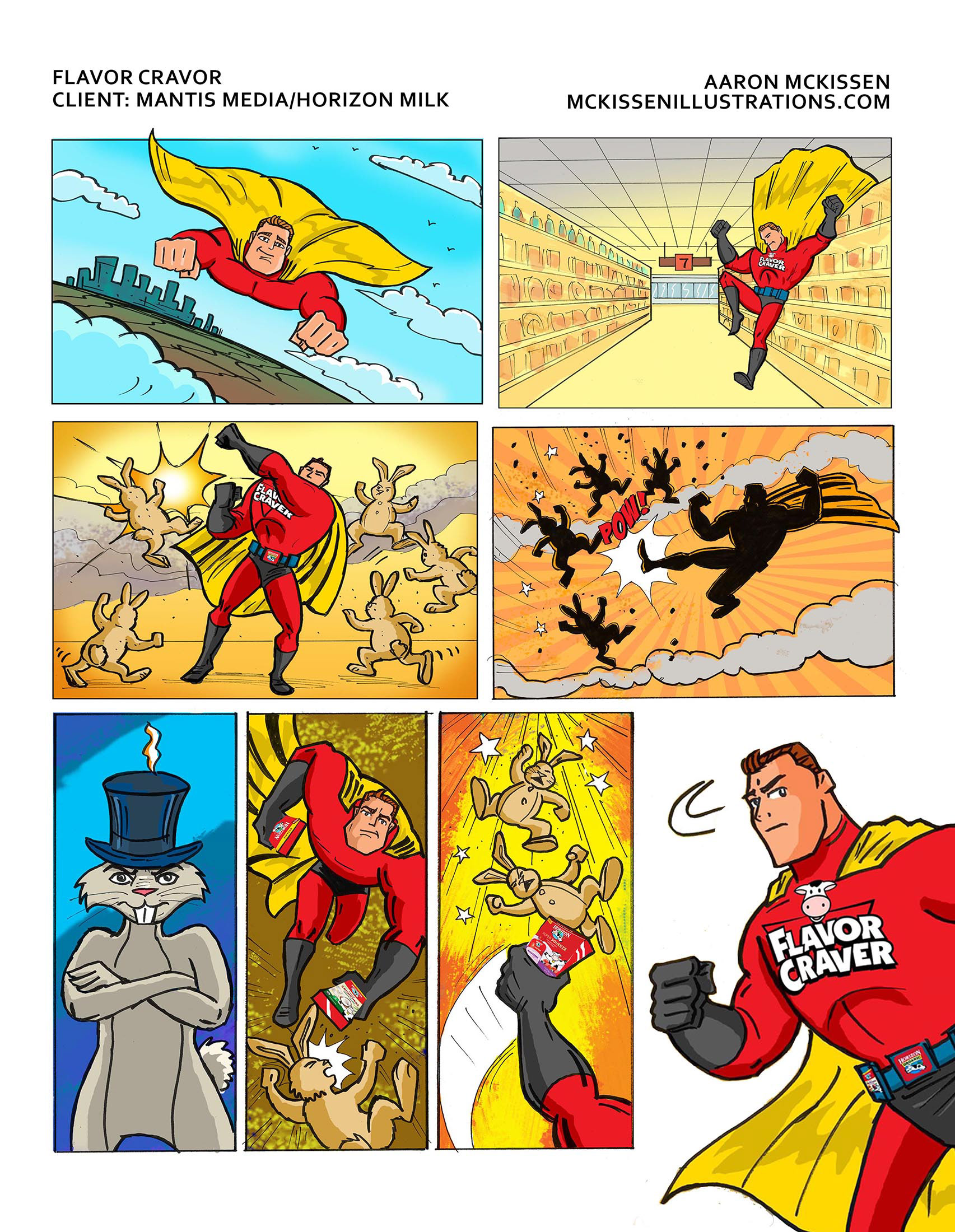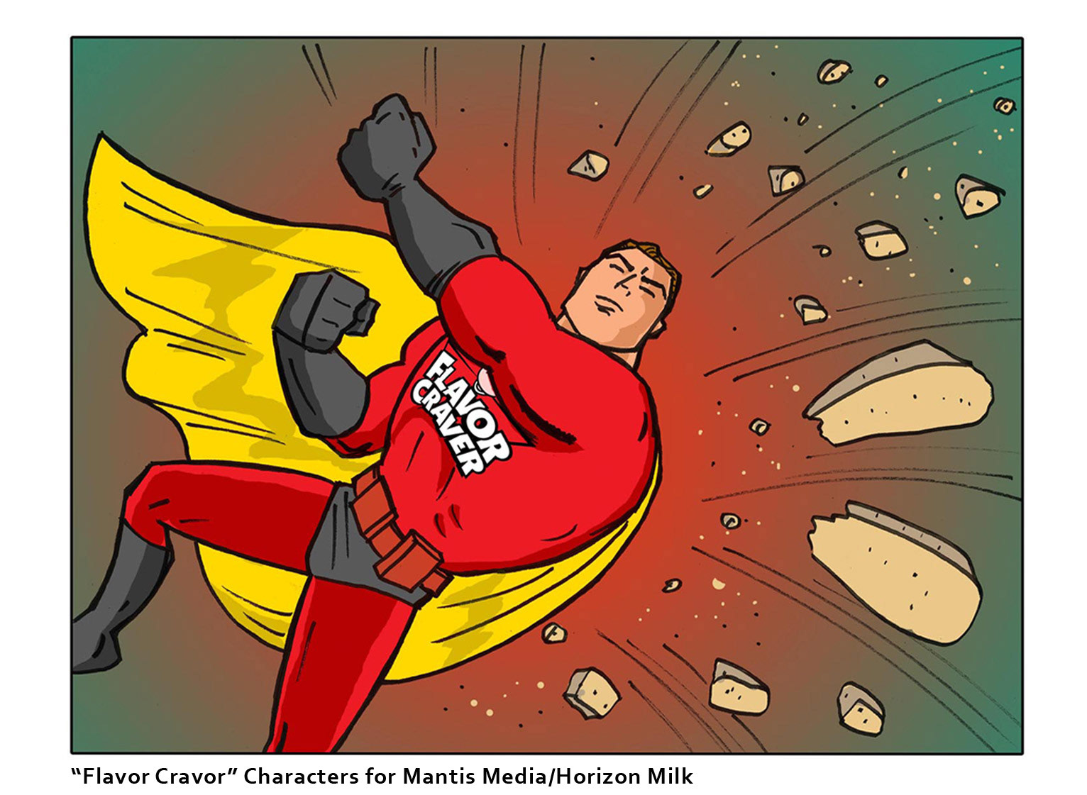 Superhero characters illustrated for Horizon Milk's character, the "Flavor Craver", 2014, Advertising/Marketing campaign.